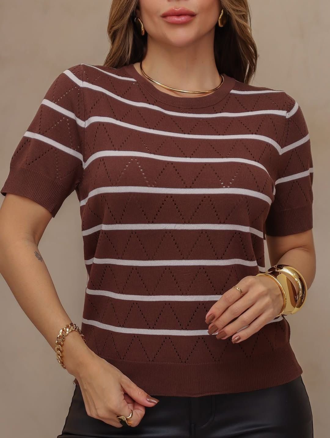 O detalhe em tramas vazadas geométricas traz um toque fashion e sutilmente sensual, sem abrir mão da delicadeza. A modelagem é ajustada ao corpo sem apertar, com mangas curtas e gola redonda, perfeita para looks casuais ou até mesmo para um office look descontraído. A estrutura da trama também adiciona sofisticação e um acabamento mais refinado à peça.