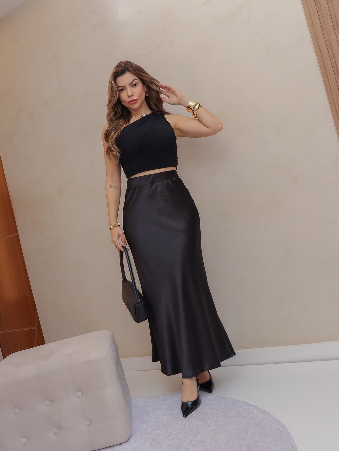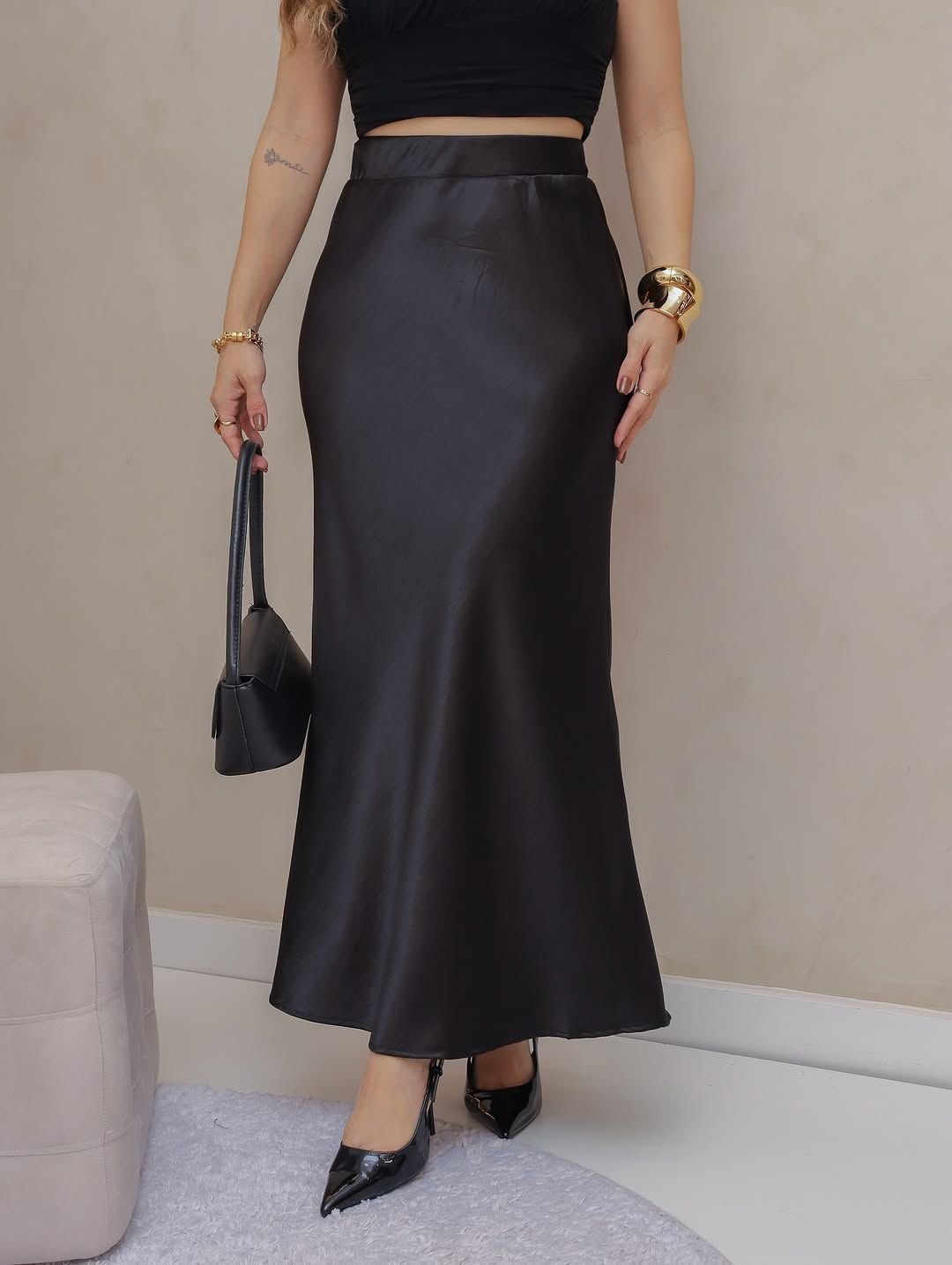Destaque: A Saia Cetim Preta é essencial no guarda-roupa feminino. Elegante, versátil e com caimento impecável, ela permite composições infinitas com muito estilo.